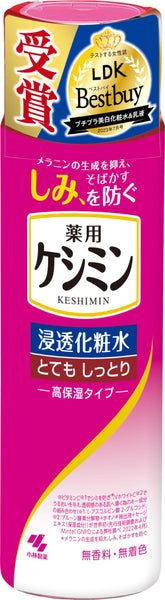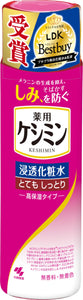 商品紹介世界初※ビタミンC ※1(シミ抑制*成分) +VホワイトC ※2(保湿成分)シミの元を分解*メラニンの生成を抑え、しみ、そばかすを防ぐ※ビタミンC※1でシミを防ぎ*、VホワイトC※2でうるおいを与え、透明感のある肌へ導く為のキー成分の組み合わせ(※1:L-アスコルビン酸 2-グルコシド、※2:プルーン酵素分解物+ホオノキ抽出液+セージエキス(保湿成分))が世界初(先行技術調査およびMintel GNPDによる弊社調べ 2022年4月)*メラニンの生成を抑え、しみ、そばかすを防ぐ保湿もしみ対策*も。薬用ケシミン浸透化粧水●ビタミンC誘導体※1 がシミの元を分解●VホワイトC ※2 配合でうるおいを与え、透明感のある肌へ●ヒアルロン酸(保湿成分)配合シミができる前に<シミの元を分解とは>シミの元が生成される過程でビタミンC誘導体※1の還元作用が働いて、メラニンの生成を抑え、しみ、そばかすを防ぐこと。使用方法<ご使用法>洗顔のあと、適量を手のひらまたはコットンにとり、お肌になじませてください。しみ対策*のスキンケアステップ1.全顔に ・ケシミンふきとりしみ対策液2.全顔に ・ケシミン浸透化粧水3.全顔に ・ケシミン美容液4.全顔に ・ケシミン密封乳液5.ポイント集中 ・ケシミンクリームまたはケシミンクリームEX*メラニンの生成を抑え、しみ、そばかすを防ぐ※1 L-アスコルビン酸 2-グルコシド※2 プルーン酵素分解物+ホオノキ抽出液+セージエキス(保湿成分)安全警告ご使用の際は、この説明書きをよく読んでご使用ください。<ご注意>●お肌に異常が生じていないかよく注意して使用してください。お肌に合わないとき、即ち次のような場合には使用を中止してください。そのまま使用を続けると症状を悪化させることがあるので、皮ふ科専門医等にご相談ください。(1)使用中、赤み、はれ、かゆみ、刺激、色抜け(白斑等)や黒ずみ等の異常があらわれた場合。(2)使用したお肌に、直射日光があたって上記のような異常があらわれた場合。●傷やはれもの、湿疹等、お肌に異常のあるときは使用しないでください。● 目に入ったときは、直ちに洗い流してください。●お子様の手の届くところには置かないでください。●極端に高温又は低温になるところや直射日光があたるところには置かないでください。●ご使用後は、「ケシミン浸透化粧水みずみずしいしっとり(ケシミンAP化粧水d)つめかえ用」をお買い求めください。●化粧水がボトルに付いた場合はきれいにふき取ってください。